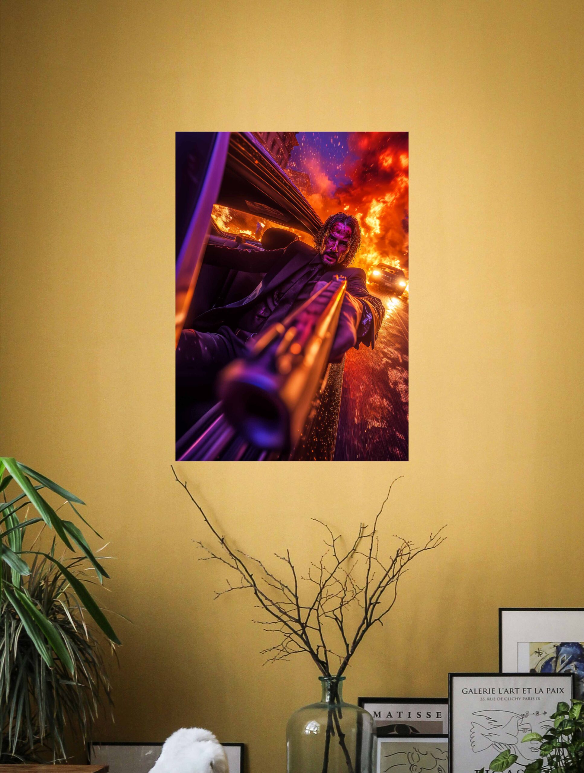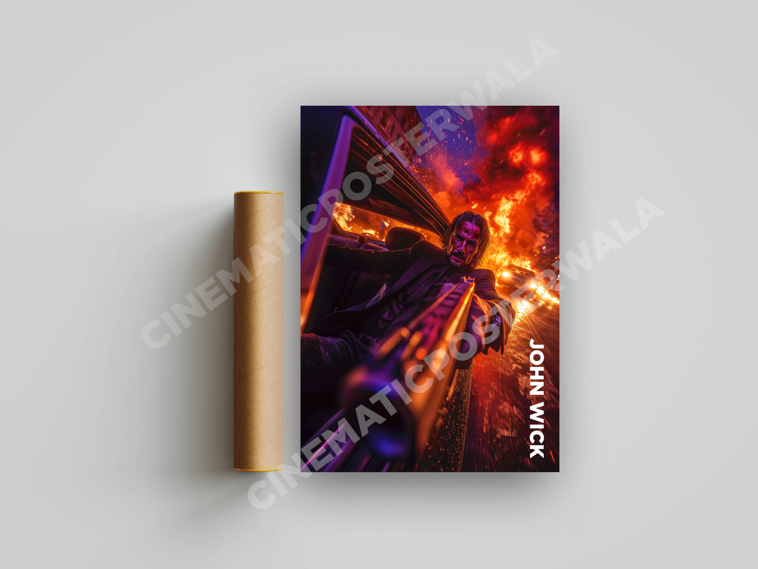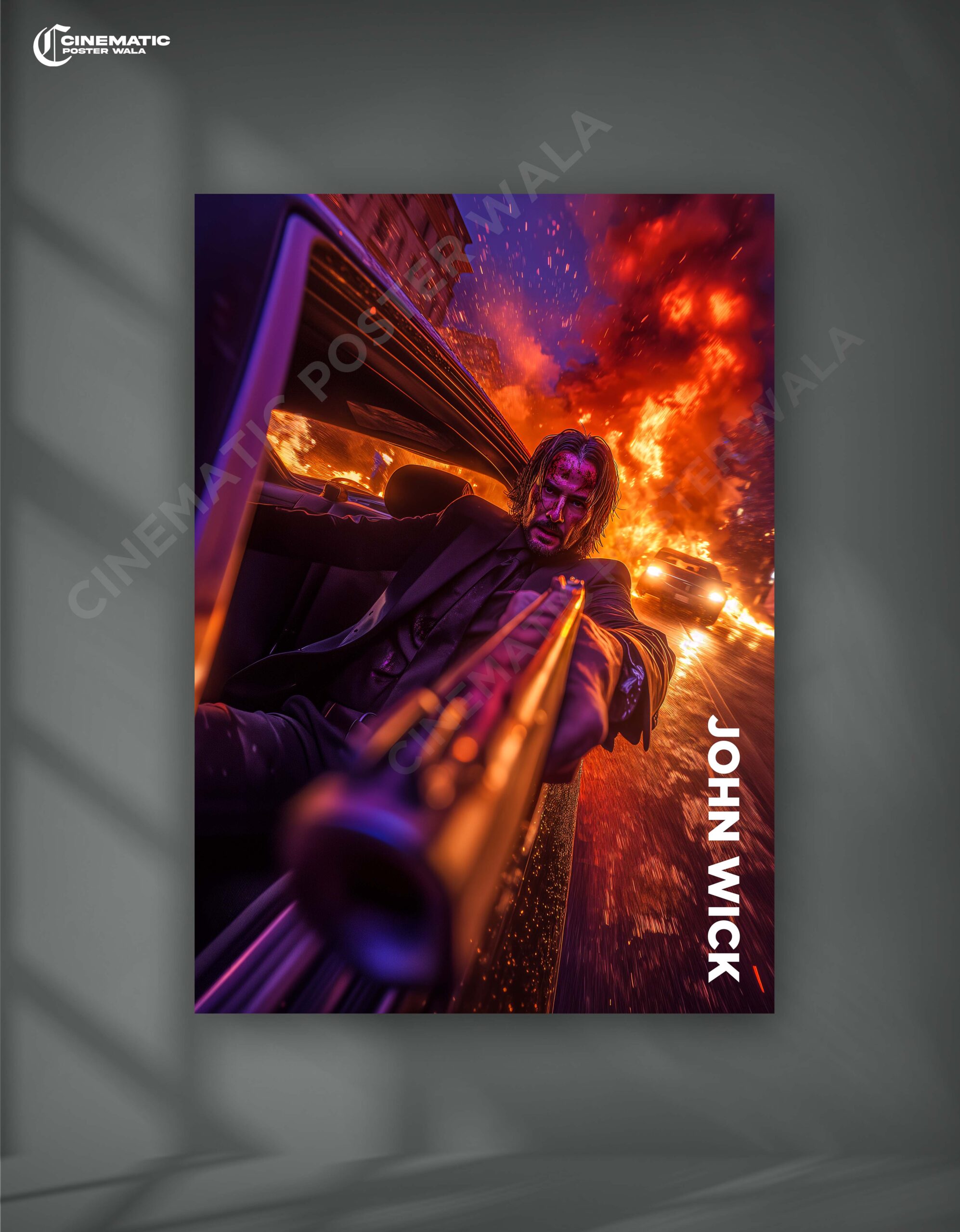 A stunning 4K premium poster of John Wick firing in action – perfect for movie lovers, gamers & stylish wall décor.